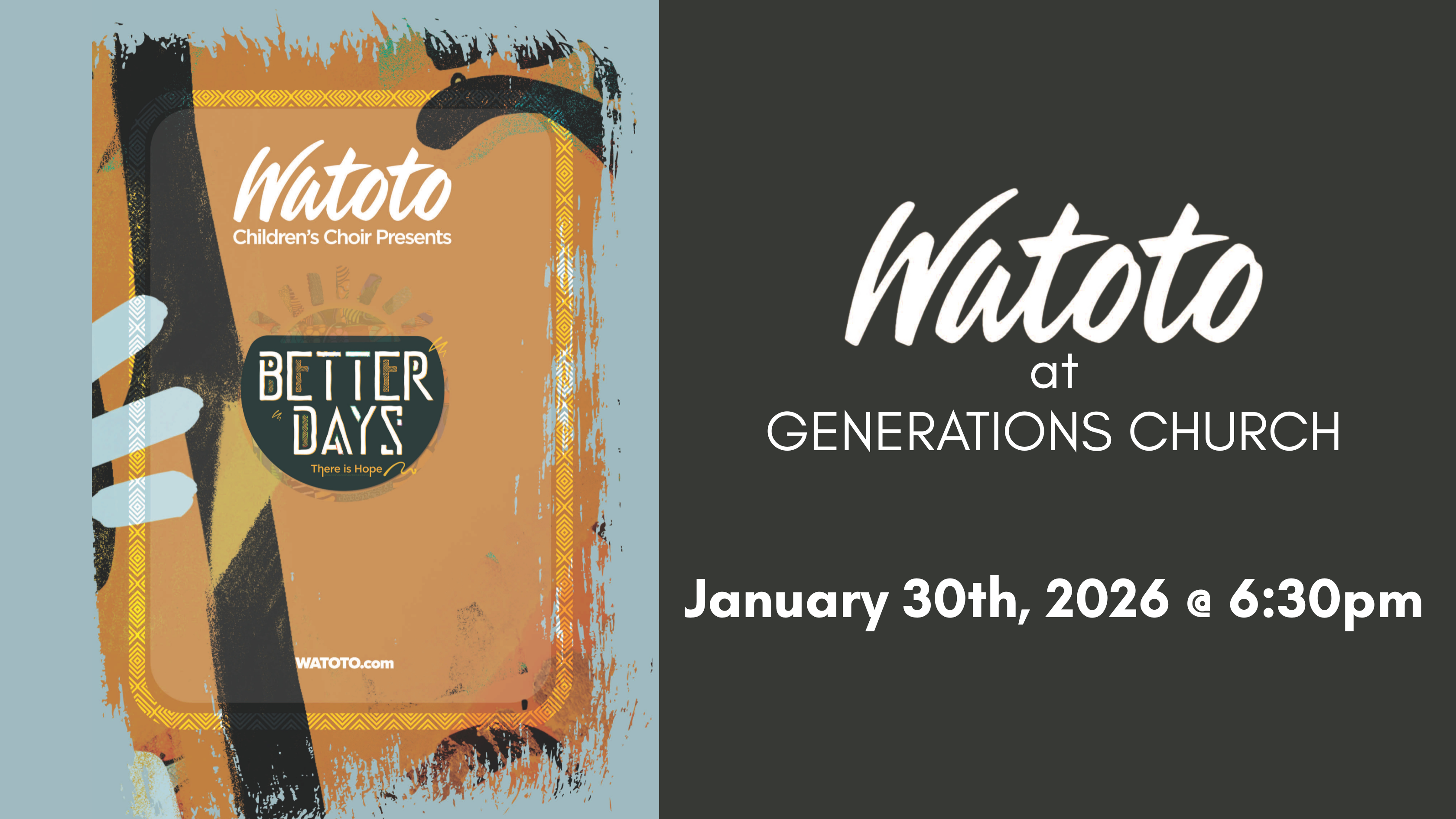Join us with your family, friends and whoever else you're able to bring for this powerful night of worship, dancing, testimonies and encouragement from Watoto's Children Choir, an internationally-renowned choir traveling the world and sharing God's goodness, salvation and hope wherever they go.